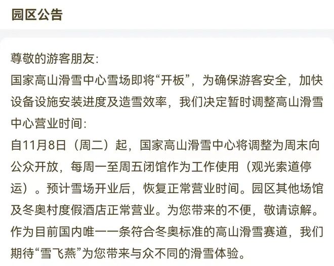 根據(jù)公告,自11月8日(周二)起,國家高山滑雪中心將調整為周末向公眾開放,每周一至周五閉館作為工作使用(觀光索道停運)。預計雪場開業(yè)后,恢復正常營業(yè)時間。目前,“雪飛燕”已對外開放,如果纜車開放,便可以乘坐纜車上到山頂。
