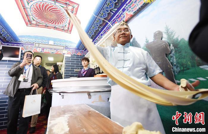 2018年4月,蘭州牛肉拉面等地方特色文化登上“環(huán)西部火車游”,旅客可以在旅途中欣賞牛肉拉面表演。(資料圖)楊艷敏 攝