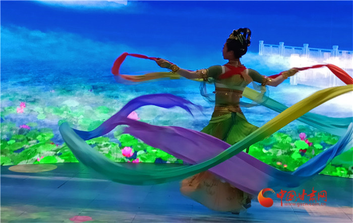 如意甘肅館選擇“以鹿王本生圖”中的綠色作為設(shè)計(jì)的主色調(diào),將敦煌元素鑲嵌在展館各個(gè)角落。特別是門口的展演舞臺(tái),經(jīng)典舞劇《絲路花雨》展演的反彈琵琶、敦煌伎樂(lè)天等將觀眾帶入了有聲有色的敦煌,成為如意甘肅館的一大吸睛之處。
