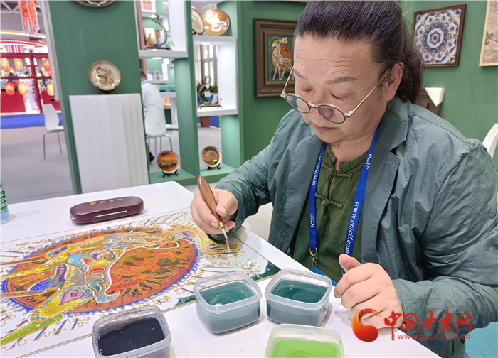 深圳文博會(huì)首日,李海明選擇現(xiàn)場制作九色鹿掐絲琺瑯畫。