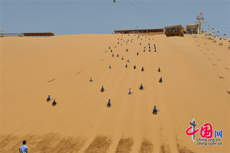 位于沙坡頭旅游區(qū)的中國(guó)國(guó)際滑沙中心,是西北地區(qū)最大的天然滑沙場(chǎng),隆起100多米高的沙坡,筆陡如削,每到天晴沙漠曬熱時(shí),人從沙坡滑下,會(huì)發(fā)出“嗡嗡”之聲,恍若鳴鐘,故有“沙坡鳴鐘”這一傳世勝景之名。