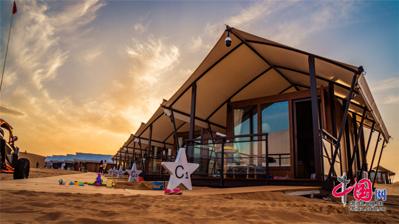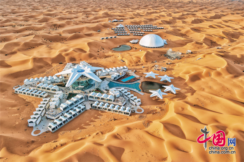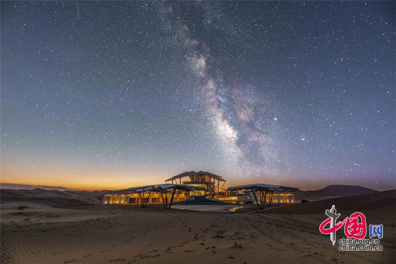 沙坡頭旅游區(qū)依托良好的生態(tài)資源,打造了國(guó)內(nèi)首個(gè)以沙漠觀星為主題打造的酒店——星星酒店,在蒼茫遼闊的沙漠之中,這座造型獨(dú)特的酒店仿佛星星一般,閃爍其中。