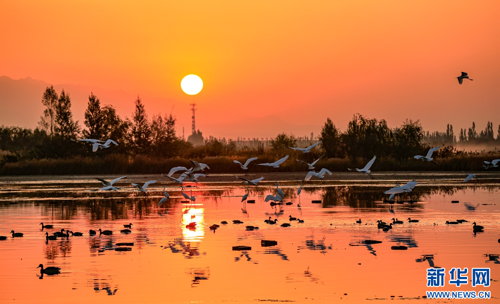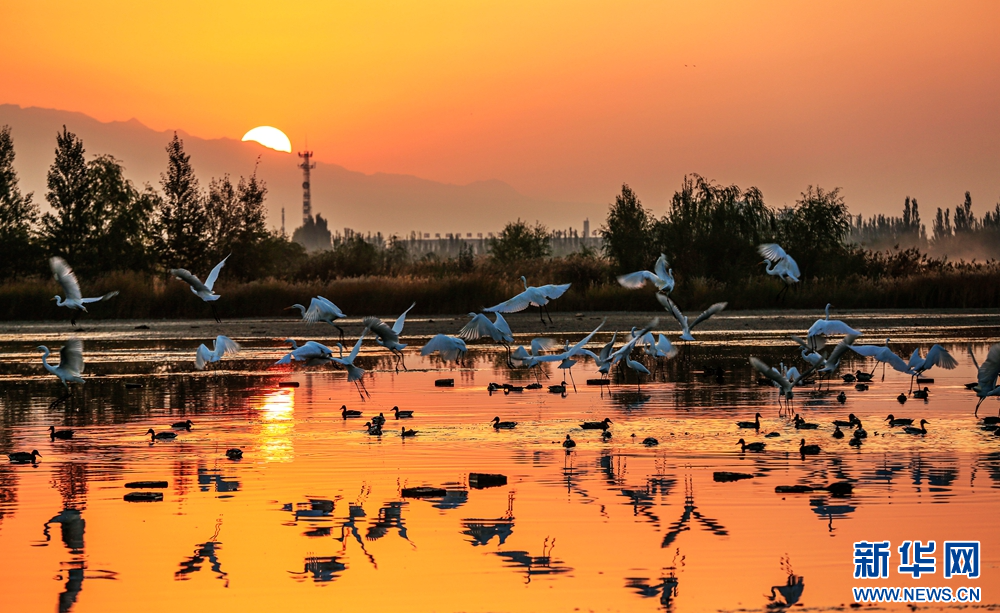 近日,在甘肅省張掖國(guó)家濕地公園,成群的白鷺迎著朝陽(yáng)悠然自得地飛翔、覓食、嬉戲,構(gòu)成了一幅朝陽(yáng)伴鷺飛的美麗畫(huà)卷。新華網(wǎng)發(fā)(陳禮 攝)