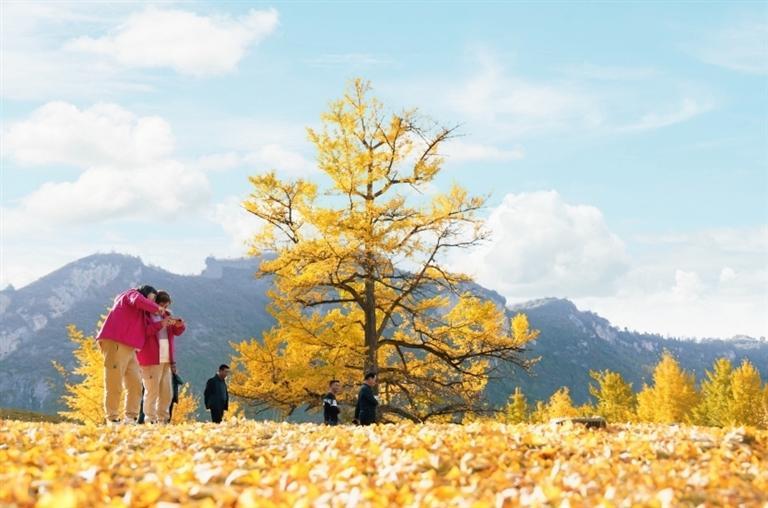 金秋時節(jié),走進徽縣嘉陵鎮(zhèn)田河村,恍若走進了金色的仙境。153棵古銀杏樹滿身金黃,一地落葉似“金色地毯”。銀杏樹下,品銀杏茶、吃銀杏果、享銀杏風(fēng)情,美不勝收,吸引眾多游客前來拍照打卡。如今,美麗風(fēng)景變身“美麗經(jīng)濟”,當(dāng)?shù)匾劳星赉y杏資源優(yōu)勢,引進“銀杏夢谷”旅游項目,打造集旅游觀光、生態(tài)康養(yǎng)、休閑娛樂、農(nóng)特產(chǎn)品銷售為一體的美麗鄉(xiāng)村旅游示范點,讓千年古樹煥發(fā)新的生機。本報記者 冉創(chuàng)昌 高瓊 攝