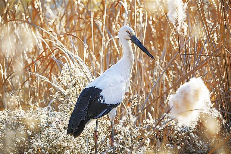 東方白鸛是一種大型涉禽,為鸛形目鸛科鳥類。其體態(tài)優(yōu)美,成鳥體長超過1米,黑翅白體,赤腳長喙,棲息于開闊的沼澤、湖泊和潮濕草地。東方白鸛是少見的旅鳥,因繁殖分布區(qū)域狹窄,野生種群數量極為稀少,在《世界自然保護聯盟瀕危物種紅色名錄》中屬于瀕危等級,是我國一級重點保護野生動物,有“鳥界國寶”“鳥類大熊貓”之稱。
