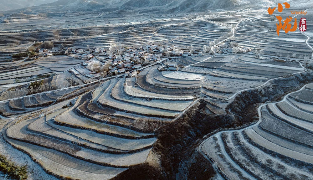 雪落千層入畫來。雪后初晴,被冬雪覆蓋的梯田,銀裝素裹,如大自然的素描,錯(cuò)落有致的線條,慢慢鋪展出一幅山村美景。