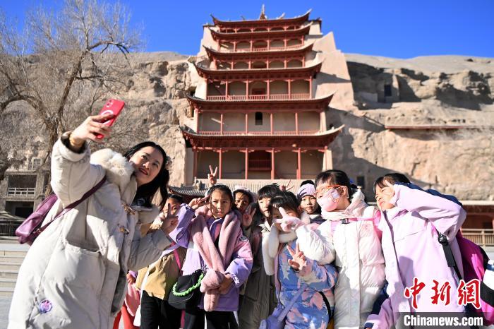 1月11日,來自青海中小學校的師生在敦煌莫高窟標志性建筑九層樓前合影留念。九美旦增 攝