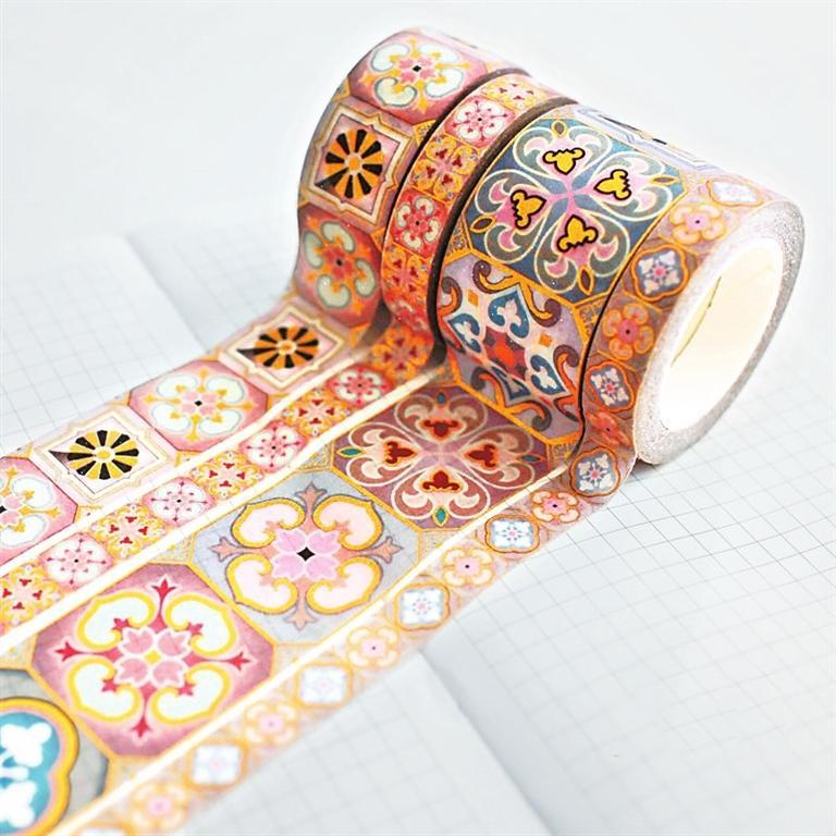 紋樣膠帶——在眾多文創(chuàng)產(chǎn)品中,膠帶的銷售或人氣排行榜靠前。紙膠帶雖是個(gè)小物件,但藝術(shù)化的紙膠帶卻能夠滿足多種需求,適應(yīng)多層次人群的需求。圖形多來自器物上的印刻、繪制圖案,或抽象或具體。這也就體現(xiàn)了兩種效果,一種是文藝范,另一種是趣味感,來自重構(gòu)傳統(tǒng)的高大上,消解歷史的審美觀。設(shè)計(jì)靈感來自中國傳統(tǒng)紋樣,融合敦煌元素,有層次的色彩斑斕,圖案以及細(xì)節(jié)都恰到好處。