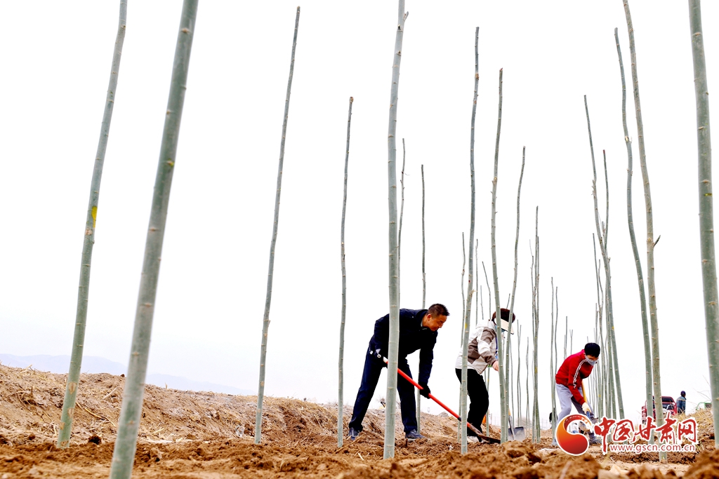 4月9日,甘肅省張掖市甘州區(qū)三閘鎮(zhèn)高寨村義務(wù)植樹基地上,千名當(dāng)?shù)馗刹柯毠ず椭驹刚邆儞]鍬鏟土挖樹坑,掀起農(nóng)田防護(hù)林建設(shè)和防沙治沙春季植樹造林熱潮。