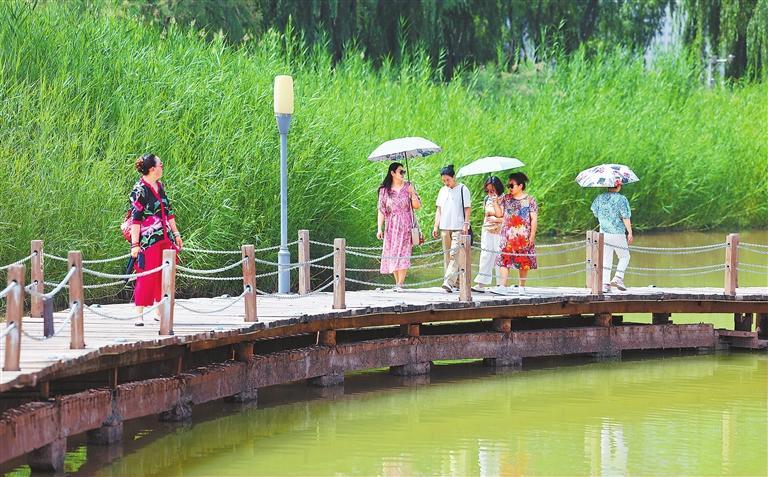 盛夏時(shí)節(jié),蘭州銀灘濕地公園綠意盎然、空氣清新。游客紛紛來到這里,享受炎炎夏日的片刻清涼。