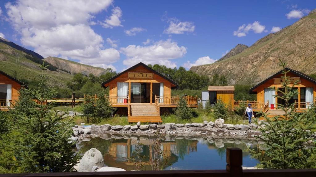 2023年7月起,安玉軍和幾戶村民改造自家院子,騰出開設農(nóng)家樂、牧家樂的房子,并打造燒烤和露營基地。步入基地,幾池清水將基地分成不同區(qū)域,木屋、牙帳、露臺散布其間,人們環(huán)繞池間小路行走,周邊連綿的祁連山上松木成林,牛羊悠閑。