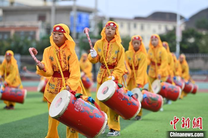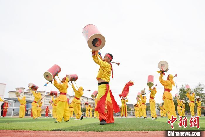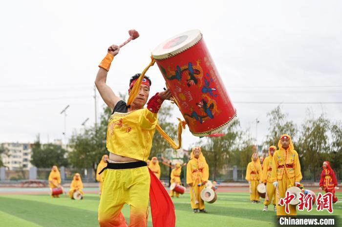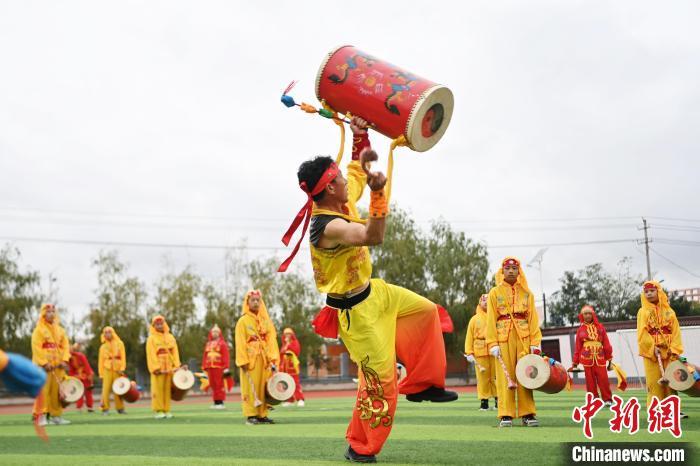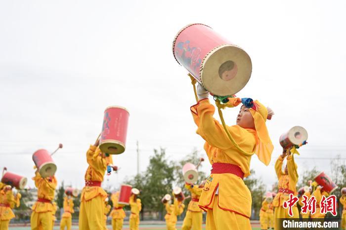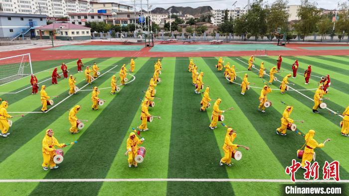 9月9日,甘肅省蘭州市皋蘭縣三川口學校學生練習蘭州太平鼓。近年來,皋蘭縣將國家級非物質(zhì)文化遺產(chǎn)蘭州太平鼓納入各中小學課后服務內(nèi)容,成立中小學太平鼓隊13支,定期邀請非遺傳承人走進校園,進行傳統(tǒng)文化授課和培訓,使學生親身感受中華優(yōu)秀傳統(tǒng)文化的魅力。蘭州太平鼓舞已有六百余年的歷史,素有“天下第一鼓”之稱,2006年被列入中國第一批非物質(zhì)文化遺產(chǎn)名錄。中新社記者 九美旦增 攝
