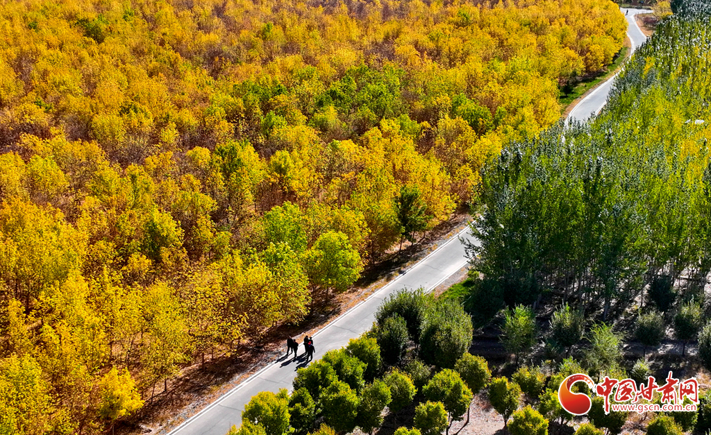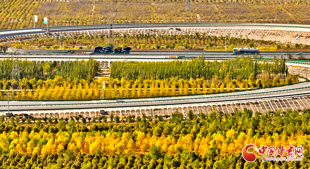 金秋時(shí)節(jié),張掖市甘州區(qū)的黑河兩岸,生態(tài)防護(hù)林的樹葉逐漸披上金色與紅色,景色迷人。尤其是那延綿的人工胡楊林景區(qū),金黃一片,層巒疊嶂,美不勝收。蘭新高鐵與連霍高速穿梭于這片林海之中,構(gòu)成了一幅動(dòng)人的風(fēng)景線。這里的空氣純凈、環(huán)境寧?kù)o、負(fù)氧離子含量豐富,成為了游客和市民休閑觀光的理想之地。