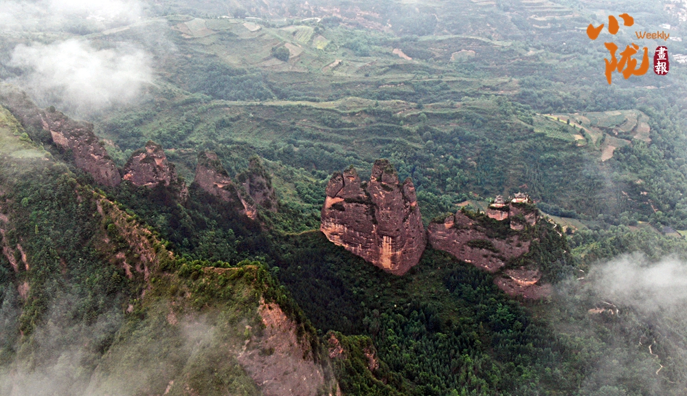 從空中俯瞰,牛頭山險(xiǎn)壑錯(cuò)綜,崖高十余丈,四面凌空,直立如削,呈現(xiàn)陽(yáng)剛挺拔之勢(shì)。
