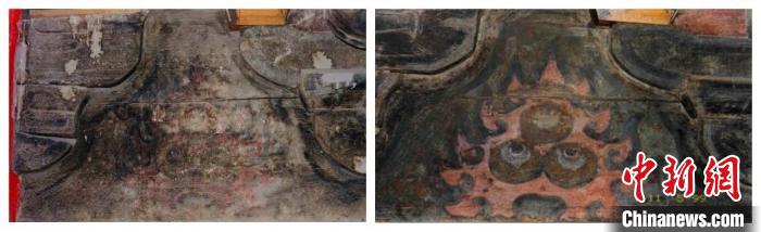 圖為1999年拍攝的長(zhǎng)樂(lè)門內(nèi)檐彩畫顏料層顯色加固前后對(duì)比。(陜西師范大學(xué)歷史文化遺產(chǎn)保護(hù)教育部工程研究中心供圖)