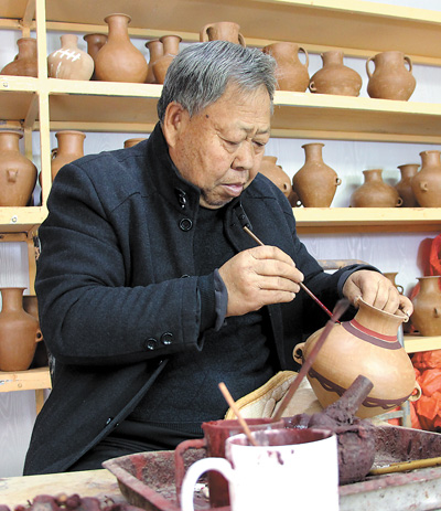64歲的閻建林(見圖,本報記者趙帥杰攝)是甘肅省級非物質(zhì)文化遺產(chǎn)項目陶器制作技藝代表性傳承人。走進他位于定西市臨洮縣洮陽鎮(zhèn)河口村的家中,院落里、窗臺上,擺滿了大大小小的陶器,足有上百種。“主要是馬家窯彩陶工藝品,敞口的是盆,帶頸的為罐,耳部安有提手的,還可以稱作壺。”閻建林介紹。