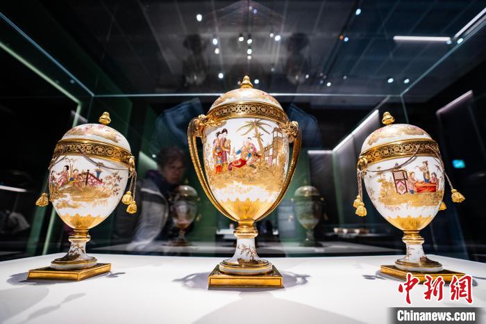 圖為凡爾賽宮藏“彩繪描金中國(guó)人物圖鑲銅鍍金高足蛋形瓶(一套)”展品吸引觀眾參觀。中新網(wǎng)記者 侯宇 攝