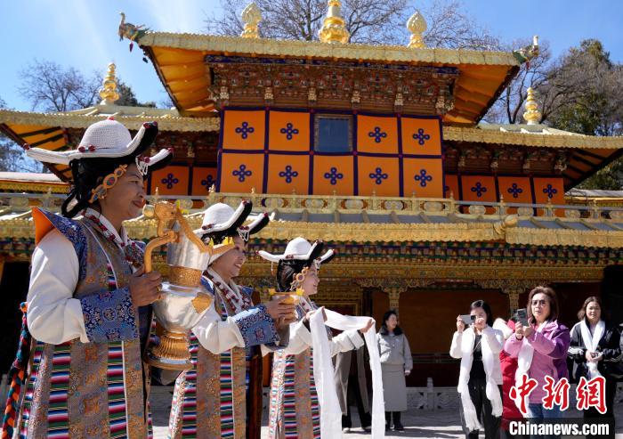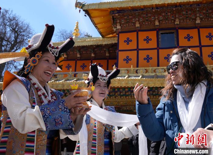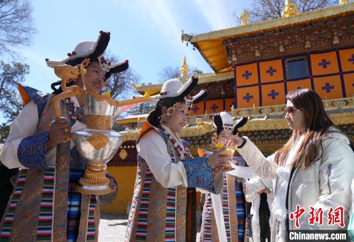 2月20日,由西藏自治區(qū)文化和旅游廳舉辦的2025年香港至拉薩航班首航旅行團歡迎儀式在羅布林卡舉行。來自香港的游客將前往布達(dá)拉宮、大昭寺等地,開啟冬游西藏旅途。2月19日,拉薩至香港的首條地區(qū)航線正式開通。航線的開通,更加便捷了兩地居民的出行,也將進(jìn)一步促進(jìn)兩地在旅游、文化、經(jīng)貿(mào)等領(lǐng)域的交流與合作。圖為歡迎儀式現(xiàn)場,工作人員向香港游客敬獻(xiàn)青稞酒。中新社記者 李林 攝