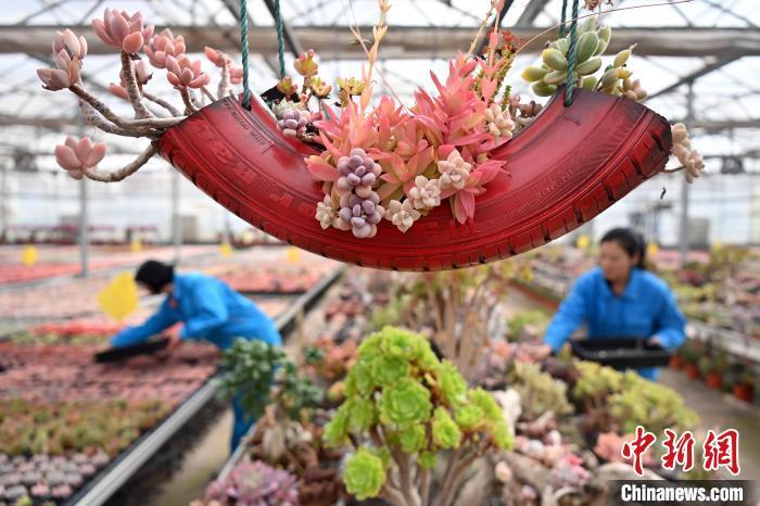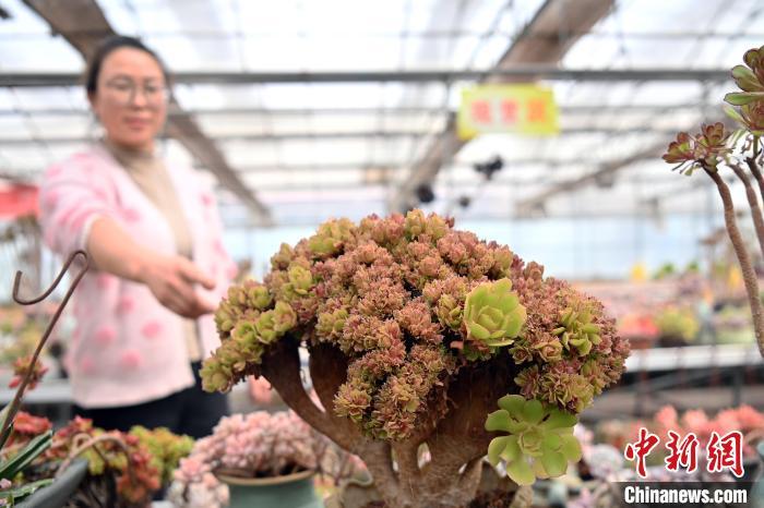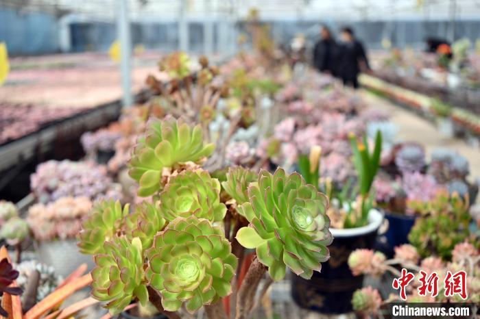 3月12日,在甘肅省蘭州市紅古區(qū)鑫源現(xiàn)代農(nóng)業(yè)科技示范園種植大棚內(nèi)種植的多肉植物。中新社記者 九美旦增 攝