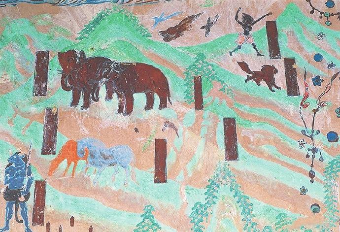 東漢應劭在《風俗通義·祀典》中寫道:“臘者,獵也,言田獵取獸以祭祀先祖也?;蛟唬?lsquo;臘者’接也,新故交接,故大祭以報功也。”意思是說一年中最后一個月是古人用來狩獵的月份,而狩獵所獲的獵物會被風干做成臘肉來祭祀祖先。這個月也被叫作“獵月”或是“臘月”。據(jù)《禮記·月令》記載,在秋季的最后一個月舉行田獵,借此機會教民戰(zhàn)陣,練習五種兵器的使用,并頒布乘馬的政令。獵畢,命令主管祭祀的官員,用獵獲的鳥獸祭祀四方之神。在莫高窟第249窟壁畫中有一幅“行獵圖”:畫面上都是些體形巨大的動物,有體態(tài)矯健的猛虎、疾馳駿逸的鹿群等。還有在奔馳的駿馬上拈弓搭箭窮追不舍的獵人、在飛奔的駿馬上淡定轉身從容射虎的獵人。整個畫面既緊張又靜謐美好,使人不由得對畫師精湛的技藝心悅誠服。