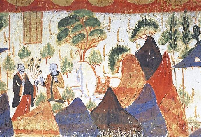 在敦煌壁畫中有關對弈的內(nèi)容較多。在莫高窟第454窟、第7窟壁畫中都有“弈棋圖”。兩幅圖的畫面有不少類似的地方:一是畫師較為突出棋盤的位置,兩幅壁畫中的棋盤都居中且形制相對巨大;二是畫面上的人物均為三人,兩人對弈,一人觀戰(zhàn),“觀棋不語真君子”;三是對弈者身后的景色都是天朗氣清、遠山含黛。據(jù)說,一天,北宋大文豪蘇東坡與摯友黃庭堅正在松樹底下弈棋。一陣風吹來,松果掉進棋盤。蘇東坡隨即吟道:“松下圍棋,松子每隨棋子落。”黃庭堅馬上回答道:“柳邊垂釣,柳絲常伴釣絲懸。”雅趣十足。其實,棋局里的一動一靜、一招一式無不需要謹小慎微、穩(wěn)扎穩(wěn)打。而對弈時的當斷則斷、示假隱真、有效合作等戰(zhàn)術不僅是對弈的智慧,也是人生的哲理吧。