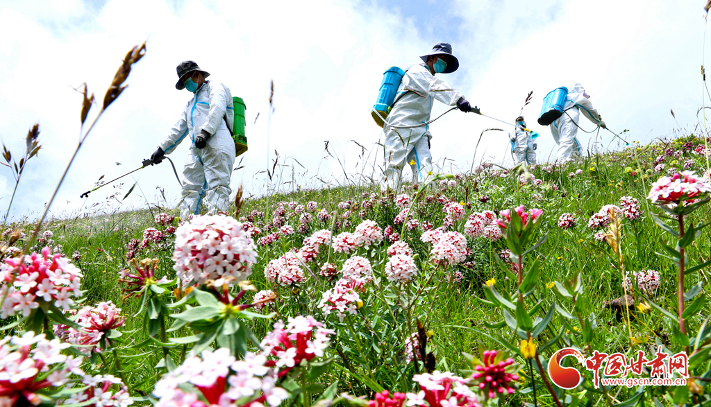 盛夏時節(jié),位于張掖市肅南裕固族自治縣的皇城夏日塔拉草原、康樂賽汗塔拉草原,宛如一塊巨大的綠色絨毯鋪向天際,滿目翠綠,令人心醉神迷。然而,此時也正是草原上狼毒花毒害草盛放、蝗蟲繁殖的高峰期。連日來,肅南縣林草專業(yè)技術(shù)人員帶領(lǐng)2000多牧民,抓住毒害草開花、蝗蟲繁殖最快,也是清除滅殺的最佳時機(jī),在“三北”工程六期160多萬畝廣袤的草原上,打響了以“蟲害防治+害草治理+噴施葉面+播撒草籽的”為核心的“三北”工程林草濕荒一體化保護(hù)修復(fù)攻堅戰(zhàn)。