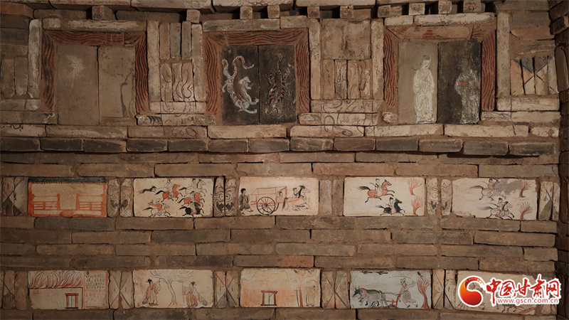 高臺縣魏晉壁畫墓,位于駱駝城東南5公里處的戈壁臺地,該墓曾兩次被盜,90年代后期由甘肅省文物考古研究所與高臺縣博物館實施搶救性清理。其中,100多塊彩繪畫像磚成為學界焦點。