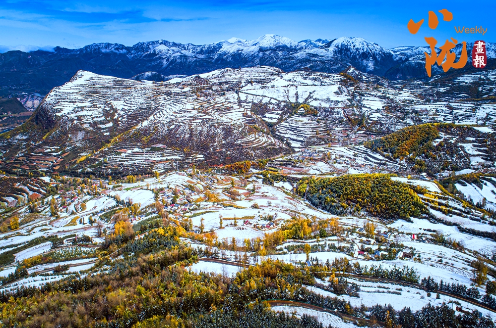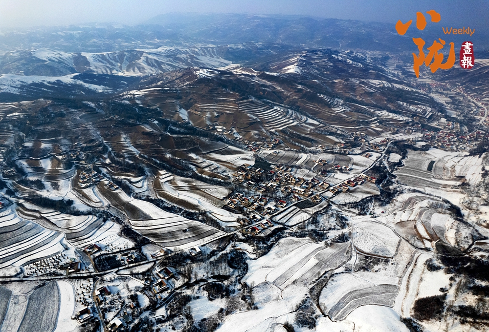 道路、溝壑、樹木、村落,被皚皚的白雪所覆蓋,呈現(xiàn)出一片“雪落山川白,美景入畫來”的美麗景象。