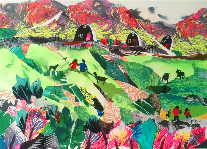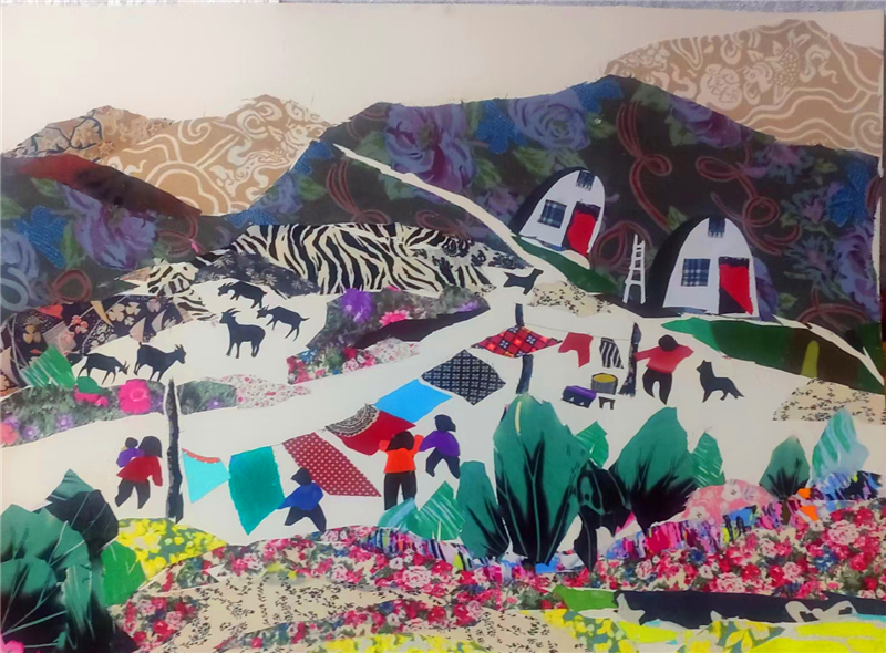 裁剪環(huán)節(jié)更見功力。她以“銳利”之心駕馭剪刀,根據(jù)畫面需求將碎布剪成不同形狀,有的需棱角分明,有的要圓潤(rùn)柔和。粘貼時(shí),她摒棄簡(jiǎn)單的粘合方式,采用傳統(tǒng)縫補(bǔ)與現(xiàn)代鑲嵌相結(jié)合的技法,讓布料與底板緊密貼合,既保證了作品的耐久性,又營(yíng)造出自然的浮雕感。在《黃土風(fēng)情》布貼畫中,她用層層疊疊的碎布表現(xiàn)黃土高原的溝壑縱橫,用深淺不一的色塊勾勒窯洞的錯(cuò)落有致,指尖翻飛間,碎布頭便有了筋骨與神韻。