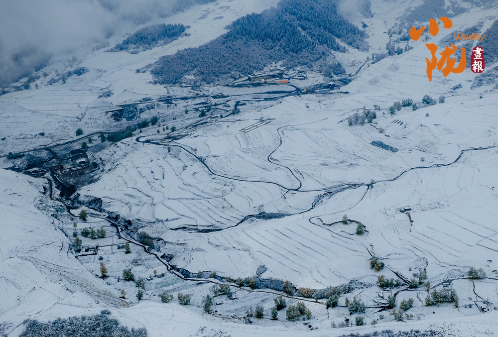 阡陌縱橫的農(nóng)田披上了素白的紗衣,天地之間,仿佛只剩下黑白兩種顏色,那遠山的輪廓,那梯田的線條,那河床的蜿蜒,構(gòu)成了最純正的中國水墨畫。