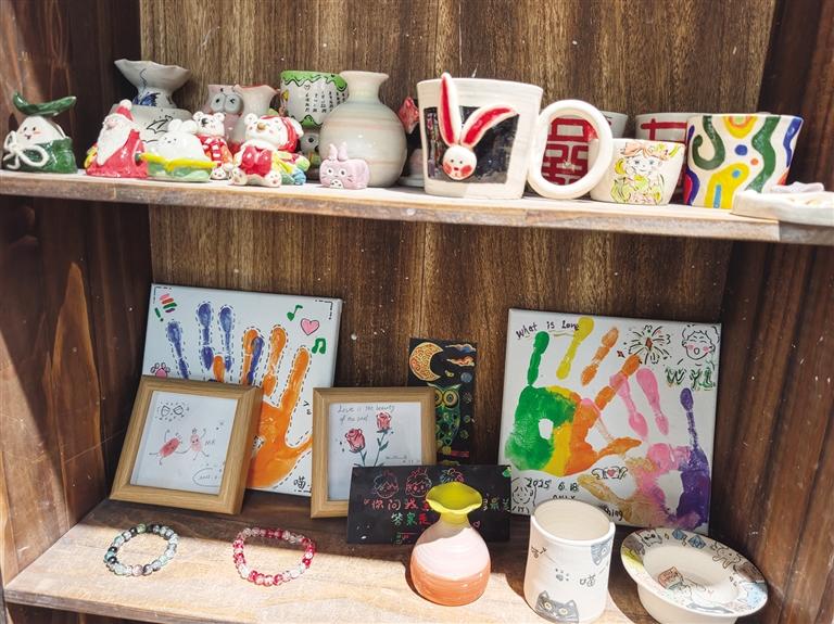 相比之下,陶藝更考驗?zāi)托摹?ldquo;陶藝看著簡單,其實上手并不容易。”工作人員說,一個杯子從揉泥、拉坯到塑形、修整,整個過程大約需要三到四個小時。如果需要燒制、上釉、成品取貨,等待時間會更長。即便如此,依然有不少愛好者愿意沉下心來,感受泥土在指尖變化的樂趣。