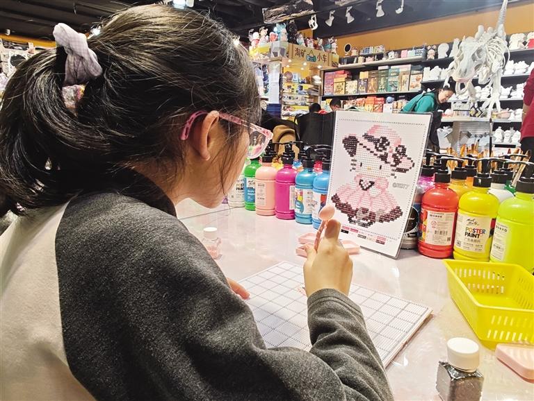 “拼這個很需要耐心,要一顆一顆擺整齊,靜下心來做,腦子一下子就放空了,煩惱都忘了。”楊婷說,學(xué)習(xí)壓力不小,手工成了低成本解壓方式。“一杯奶茶錢,就能換來一下午的寧靜和快樂,比盲目逛街、刷手機(jī)有意義。”