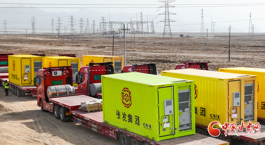3月19日,張掖市山丹縣東樂灘上,大型運輸車輛正在拉運一臺臺“超級充電寶”。