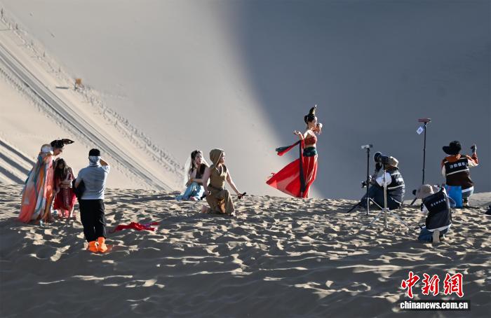 原標題:甘肅敦煌鳴沙山下古風(fēng)服飾旅拍成“留量”