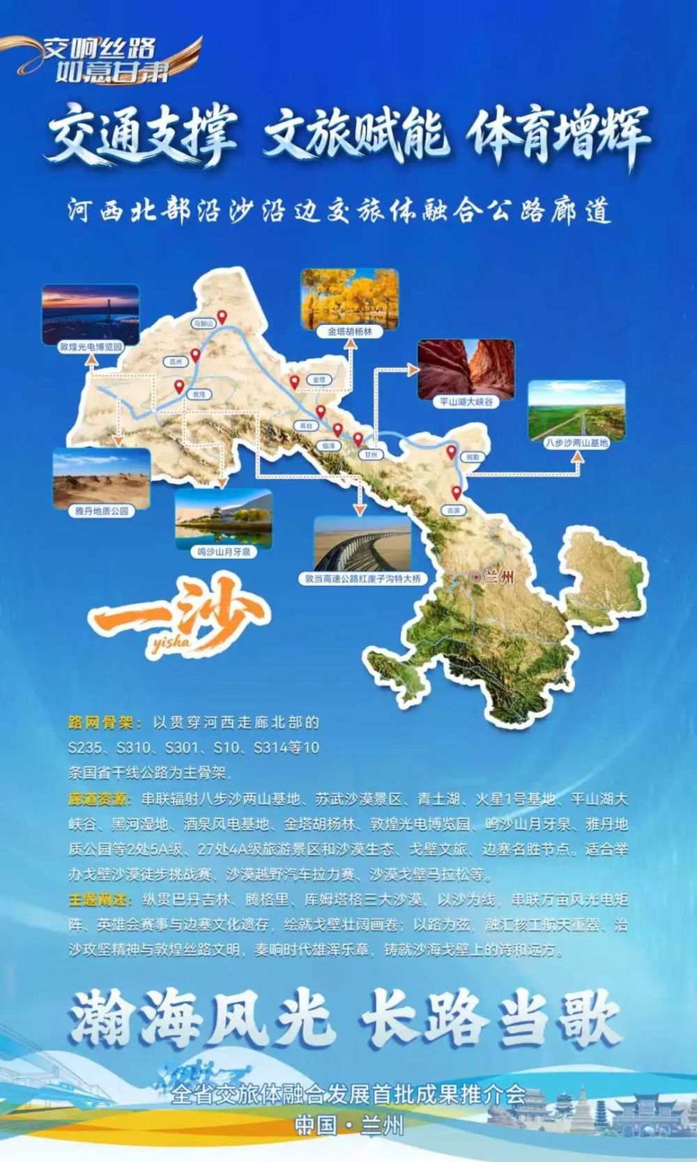 以“瀚海風(fēng)光?長路當(dāng)歌”為主題,打造河西北部沿沙沿邊交旅體融合廊道,即“一沙廊道”。