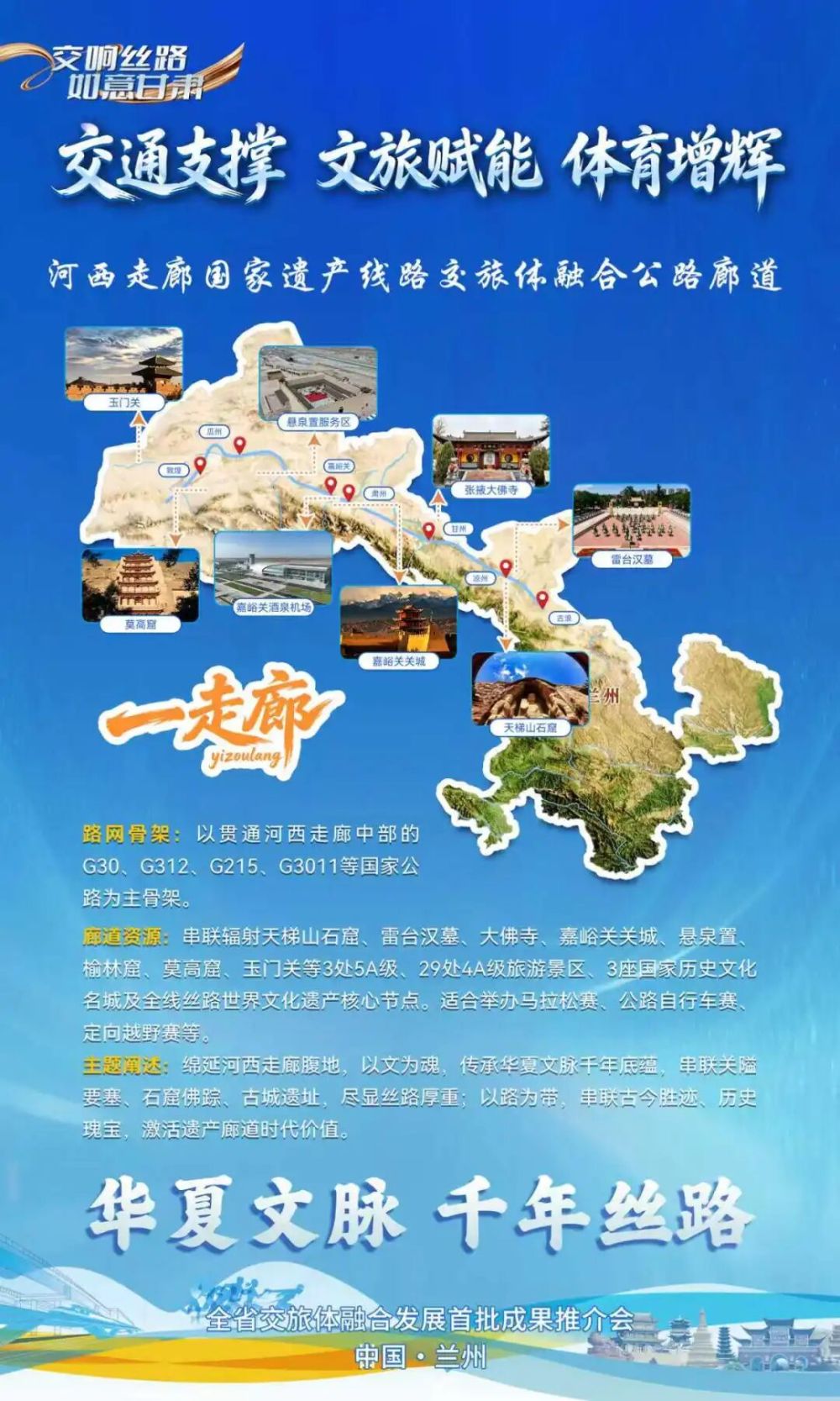 以“華夏文脈 千年絲路”為主題,打造河西走廊國家遺產(chǎn)線路交旅體融合廊道,即“一走廊廊道”。