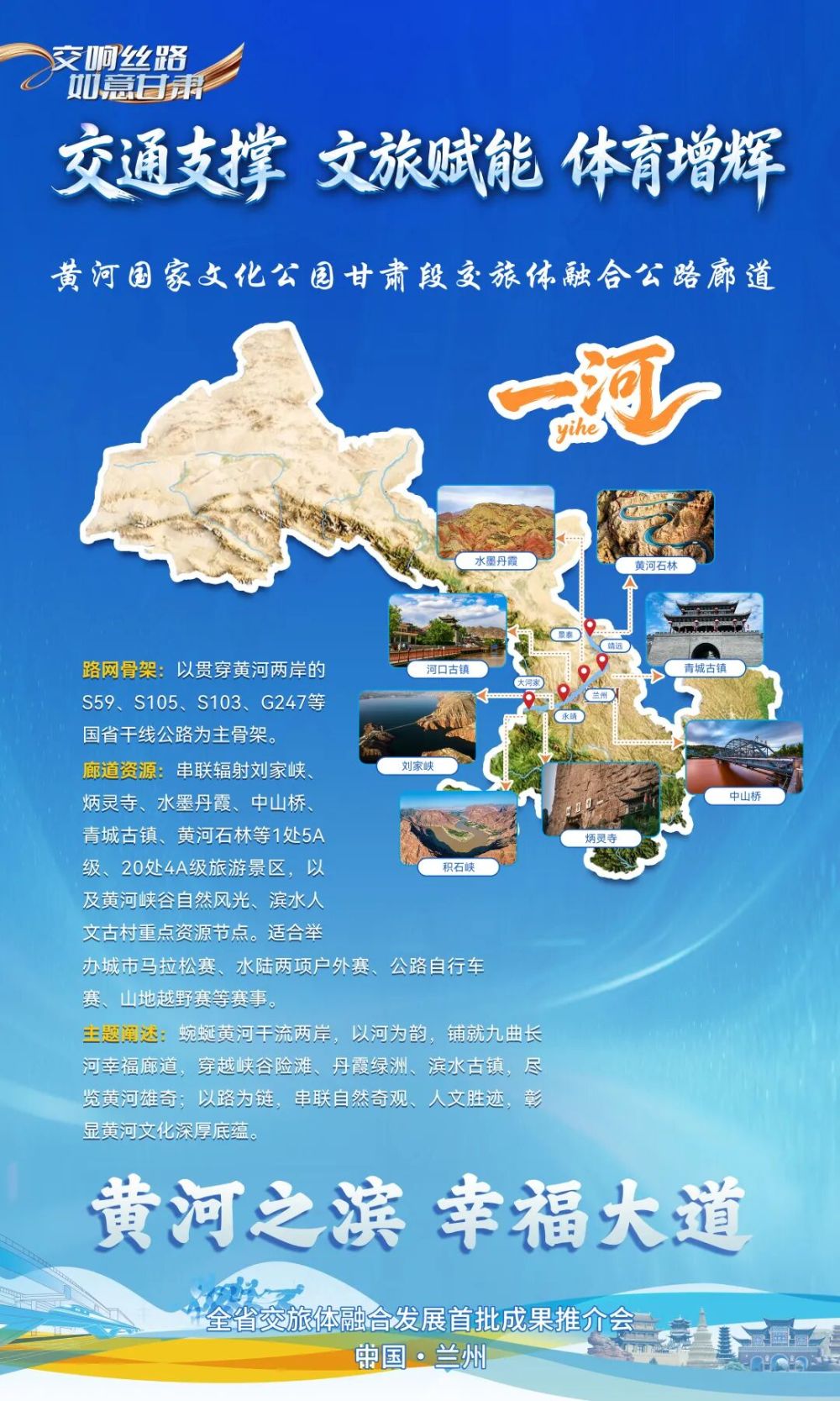 以“黃河之濱?幸福大道”為主題,打造黃河國家文化公園甘肅段交旅體融合廊道,即“一河廊道”。